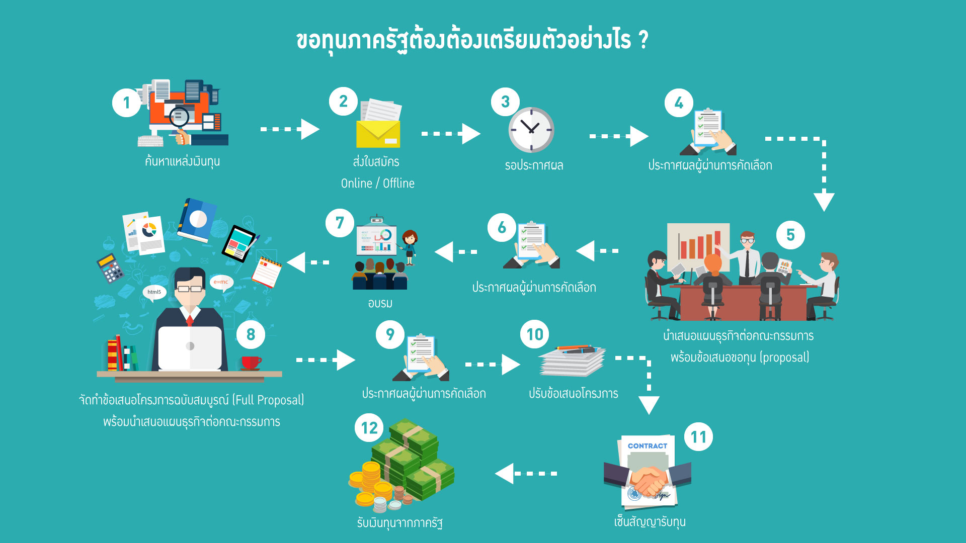จัดทำข้อเสนอโครงการฉบับสมบูรณ์และจัดเตรียมการนำเสนอเพื่อนำเสนอต่อคณะกรรมการในรอบตัดสิน โดยระยะเวลาในการจัดส่งและนำเสนอขึ้นประกาศของแหล่งทุนนั้นๆ